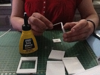 Ahora toca revestir el horno, con carton grueso pintado de negro. Los soportes para las bandejas son palillos cortados, pegados y pintados en negro.